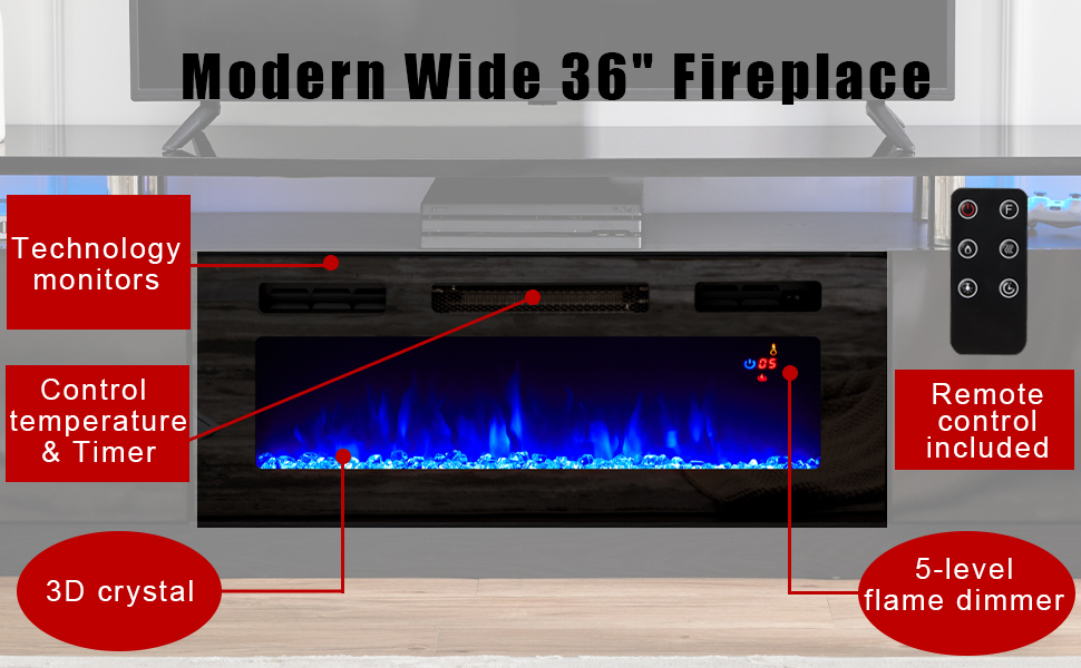 - 36" wide modern electric fireplace features 3 color realistic flame&5 level brightness,temperature control and time setting.750W/1500W Power heats quicker & energy efficient for max 4800 BTU output.Remote control included.