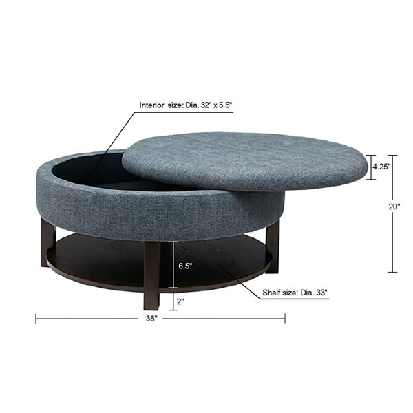 There is no need to sacrifice style for storage with this round storage ottoman. Featuring a tufted top that lifts to reveal ample interior storage space, this round ottoman centralizes the clutter and becomes a stylish addition to your living room. There is also an additional veneer shelf to store magazines and newspapers.